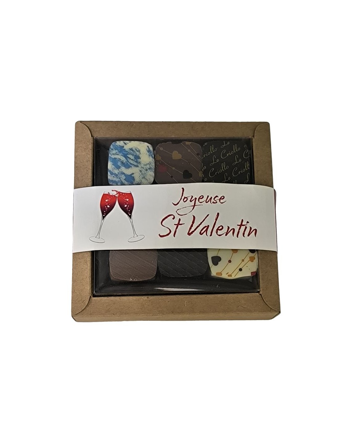 Garnie de 3 chocolats de notre assortiment dont un chocolat spécialement conçu pour la Saint Valentin, cette boîte sera une délicate attention pour l'élu(e) de votre coeur
