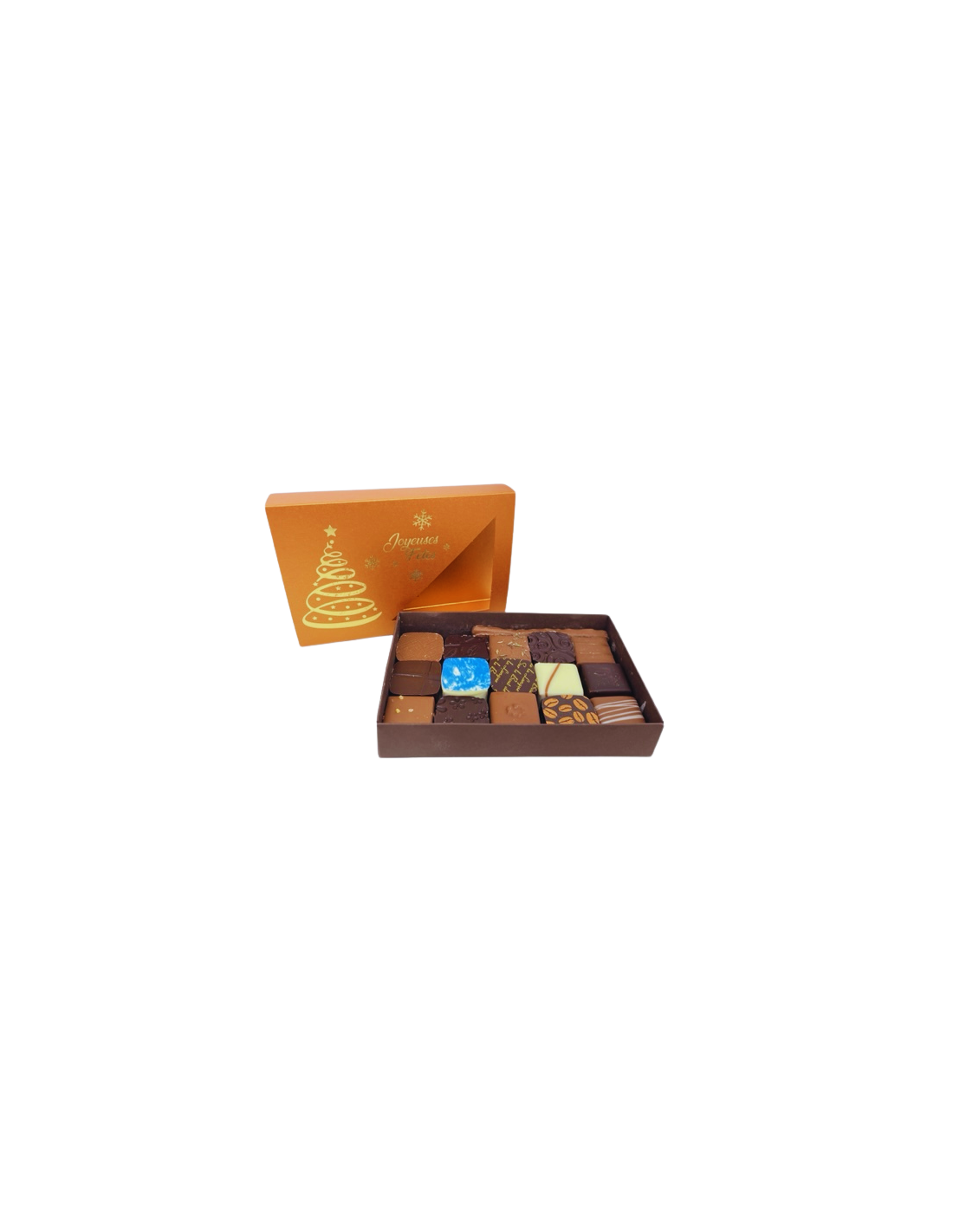 Palette de parfums et textures au fil des ganaches, pralinés, pâtes d'amande et orangettes. Toute une collection en chocolat noir, chocolat au lait et chocolat blanc. Coffret pour un plaisir personnel ou bien pour le plaisir d'offrir… Un assortiment gourmet et gourmand !