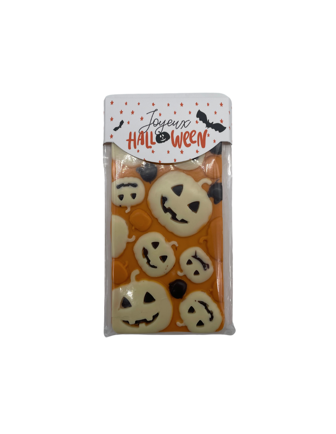 Une tablette de chocolat décorée de citrouilles à déguster pour Halloween