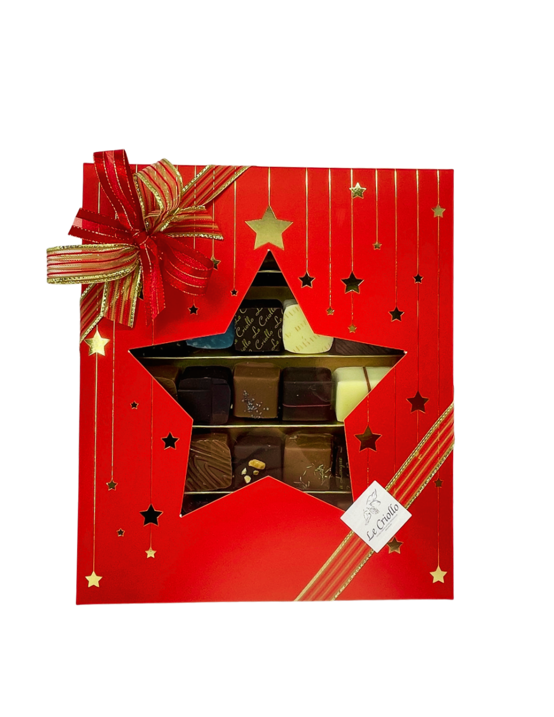 Chocolats d’enrobage « Pur beurre de cacao » chocolat au lait (cacao 31,5% minimum) : sucre, beurre de cacao, poudre de lait entier, pâte de cacao, émulsifiant : lécithine de soja non OGM, arôme vanille naturelle ; chocolat noir (cacao 73% mini) ; chocolat blanc . Intérieurs : pâte d’amandes (amandes, sucre) ; pâte d’amandes à la pistache (sucre, amandes, pistaches) ; pâte de noix (cerneau de noix, sucre inverti, beurre de cacao, sorbitol) ; noisettes, amandes, cacahuètes, purées de cassis, framboise, ananas, fraise, fruit de la passion, figues ; croustillant (farine de blé, sucre, matière grasse de lait anhydre, lactosérum en poudre, sel, extrait de malt d’orge, poudre à lever (carbonate acide de sodium) ; riz soufflé caramélisé (farine de riz, sucre) ; chocolat au lait au caramel ; gingembre confit (sulfite de sodium) ; crème UHT (crème de lait, stabilisant : carraghénanes, émulsifiants E472B ; écorces d'oranges confites ; noix de coco râpée ; éclats de fèves de cacao ; thym ; beurre salé aux cristaux de sel de Guérande ; beurre laitier ; épices ; concentré d'orange et de citron, vanille ; cannelle ; café ; miel ; curry ; arôme naturel de cèpes ; huiles essentielles de menthe ; graines de pavot ; arômes ; colorants alimentaires naturels ; stabilisant : sorbitol ; conservateurs : sucre inverti, sirop de glucose, acidifiant : acide citrique.