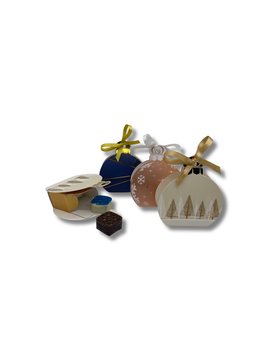 Chocolats d’enrobage « Pur beurre de cacao » chocolat au lait (cacao 31,5% minimum) : sucre, beurre de cacao, poudre de lait entier, pâte de cacao, émulsifiant : lécithine de soja non OGM, arôme vanille naturelle ; chocolat noir (cacao 73% mini) ; chocolat blanc . Intérieurs : pâte d’amandes (amandes, sucre) ; pâte d’amandes à la pistache (sucre, amandes, pistaches) ; pâte de noix (cerneau de noix, sucre inverti, beurre de cacao, sorbitol) ; noisettes, amandes, cacahuètes, purées de cassis, framboise, ananas, fraise, fruit de la passion, figues ; croustillant (farine de blé, sucre, matière grasse de lait anhydre, lactosérum en poudre, sel, extrait de malt d’orge, poudre à lever (carbonate acide de sodium) ; riz soufflé caramélisé (farine de riz, sucre) ; chocolat au lait au caramel ; gingembre confit (sulfite de sodium) ; crème UHT (crème de lait, stabilisant : carraghénanes, émulsifiants E472B ; écorces d'oranges confites ; noix de coco râpée ; éclats de fèves de cacao ; thym ; beurre salé aux cristaux de sel de Guérande ; beurre laitier ; épices ; concentré d'orange et de citron, vanille ; cannelle ; café ; miel ; curry ; arôme naturel de cèpes ; huiles essentielles de menthe ; graines de pavot ; arômes ; colorants alimentaires naturels ; stabilisant : sorbitol ; conservateurs : sucre inverti, sirop de glucose, acidifiant : acide citrique.