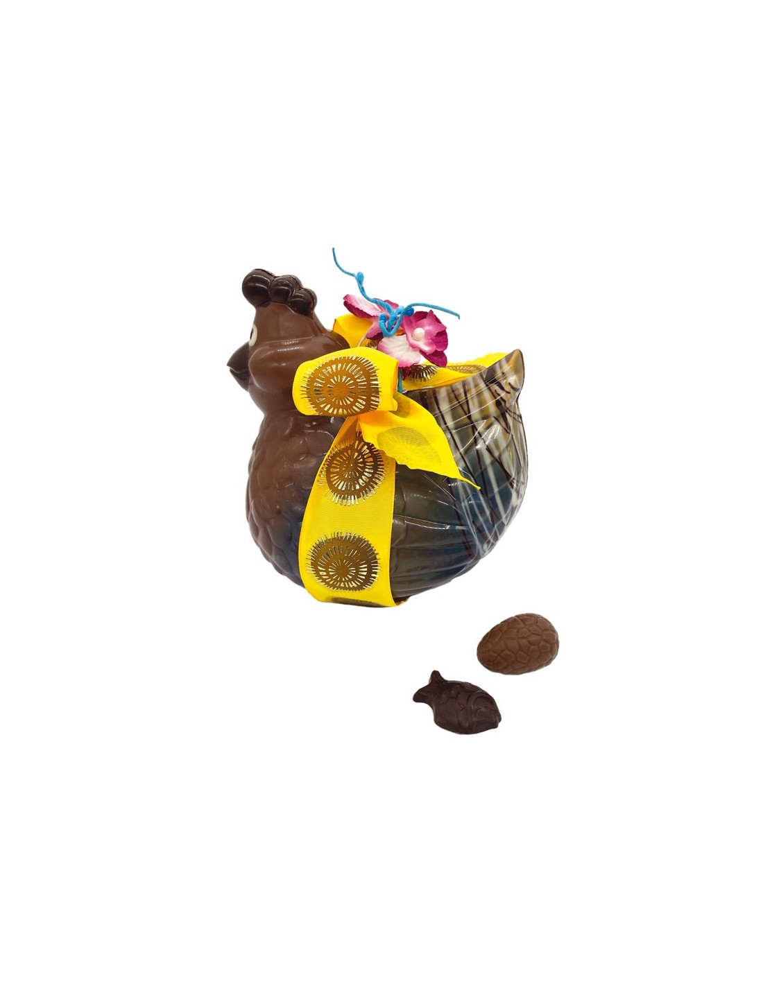 un moulage en chocolat blanc, lait ou noir, garni de friture de Pâques et d'oeufs pralinés enrobés de chocolat noir, lait et blanc (300g)