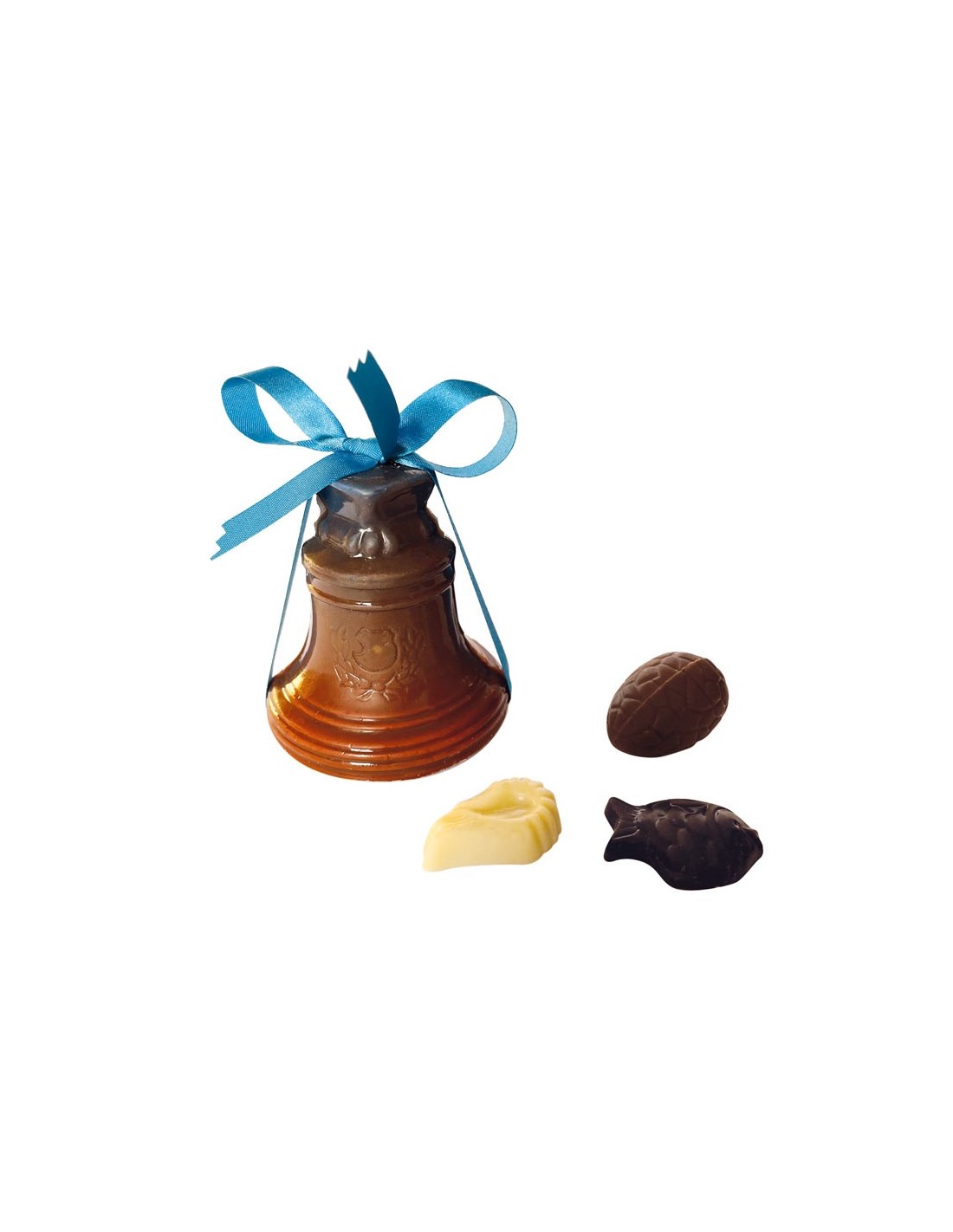 un moulage en chocolat blanc, lait ou noir, garni de friture de Pâques et d'oeufs pralinés enrobés de chocolat noir, lait et blanc
