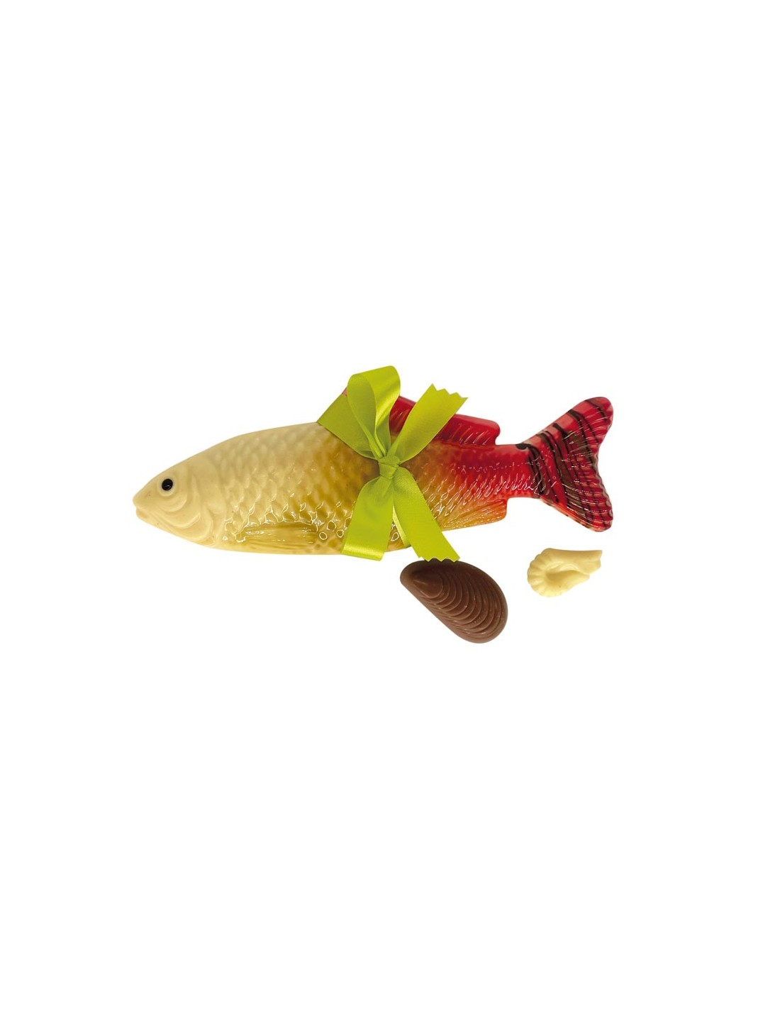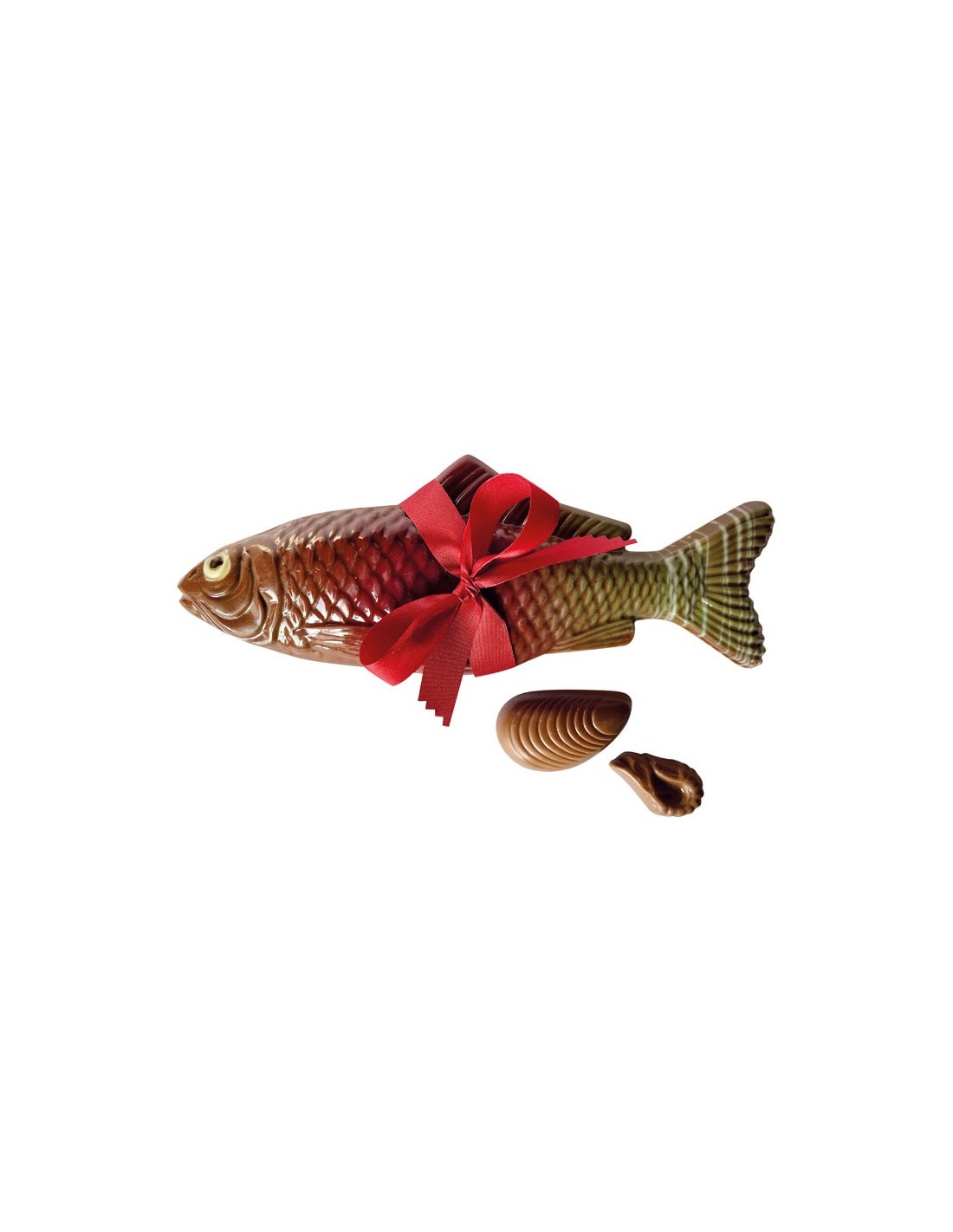 un moulage en chocolat blanc, lait ou noir, garni de friture de Pâques et de fruits de mer pralinés enrobés de chocolat noir, lait et blanc