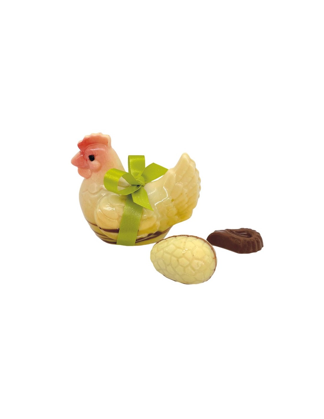 un moulage en chocolat blanc, lait ou noir, garni de friture de Pâques et d'oeufs pralinés enrobés de chocolat noir, lait et blanc
