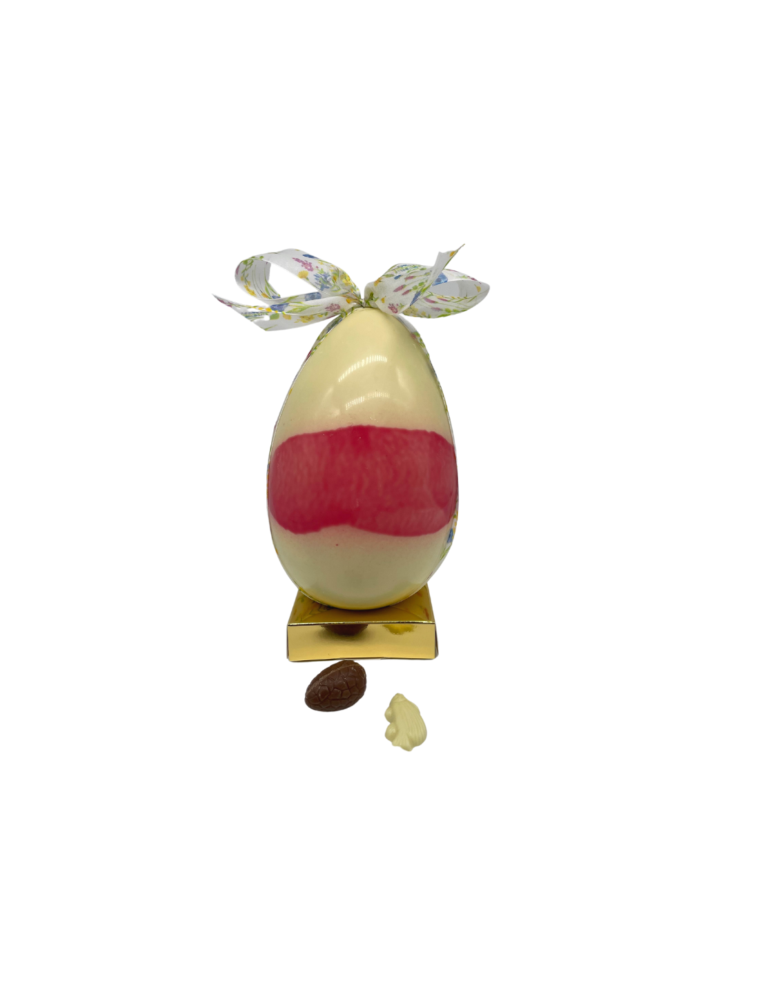 un moulage en chocolat blanc, lait ou noir, garni de friture de Pâques et d'oeufs pralinés enrobés de chocolat noir, lait et blanc